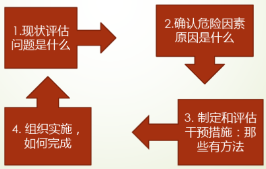 老年人跌倒干预因遵循一定的工作流程,世界卫生组织推荐的伤害预防四步骤公共卫生方法(见下图)可用作老年人跌倒的干预流程和工作模式。